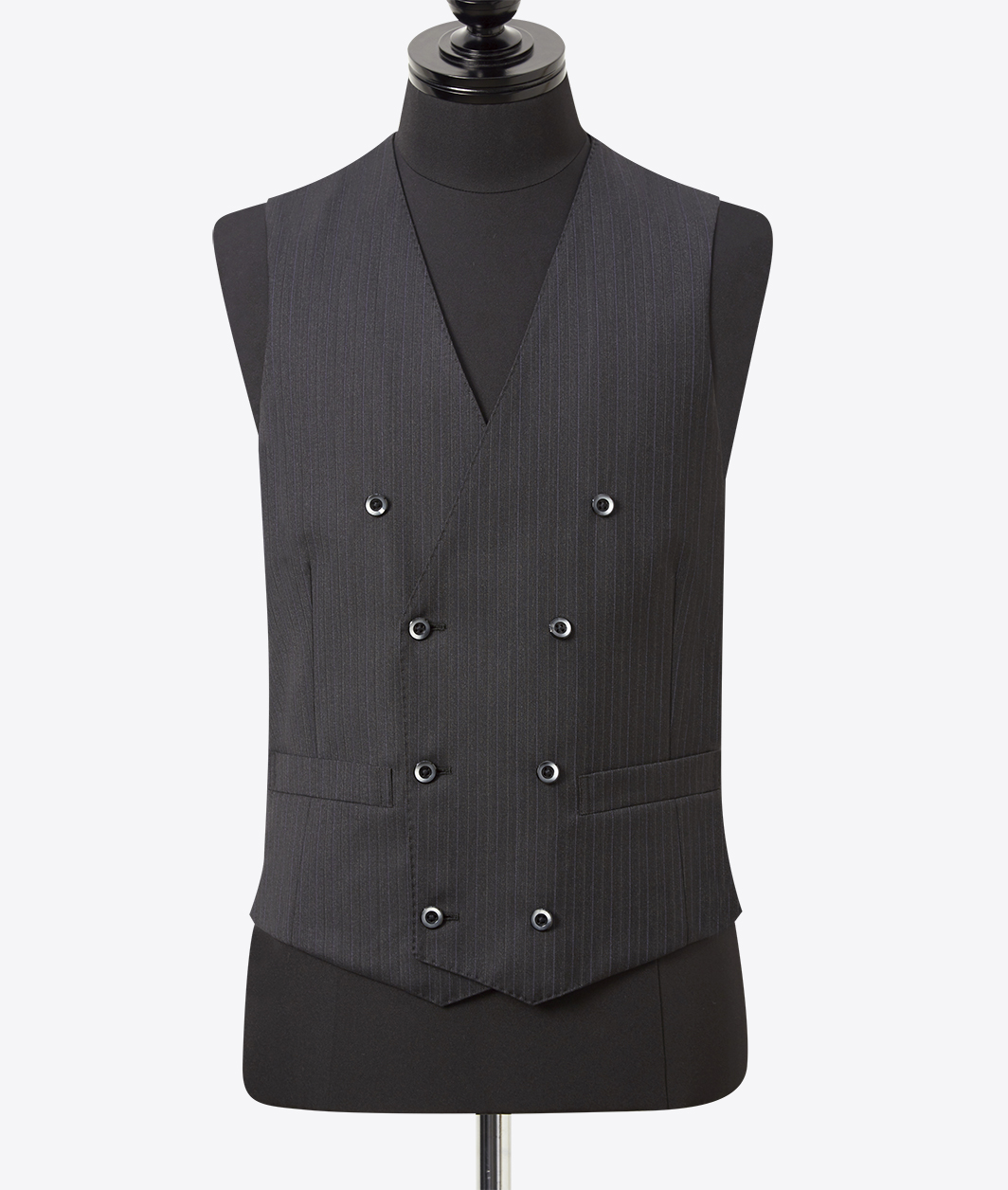 通常、ダブルのベストは裾がまっすぐカットされたスクエアですが、グローバルスタイルは形状を変えてスタイリッシュな印象にしています。