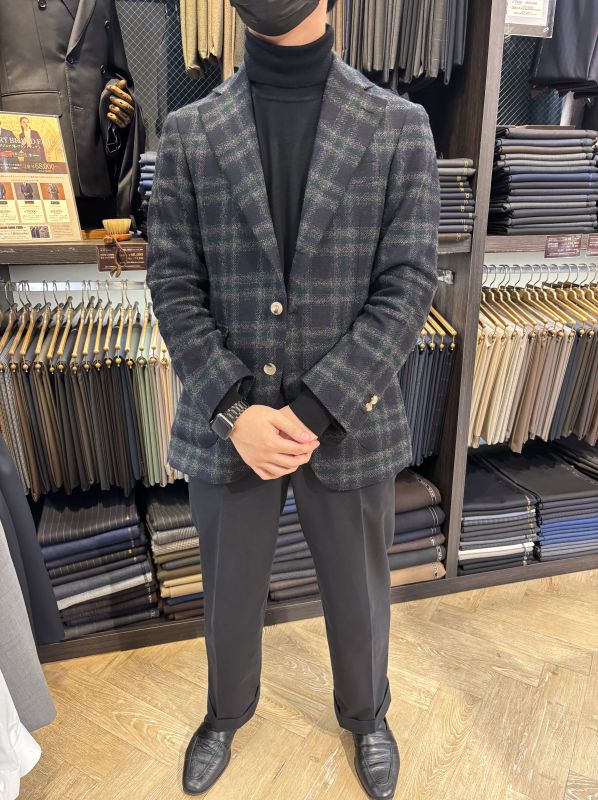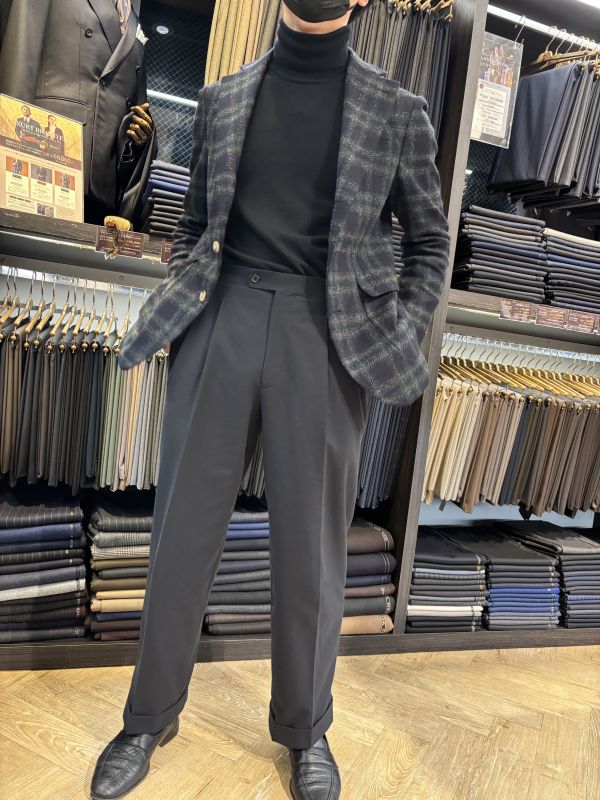 ブラックウォッチのジャケットにブラックスラックスを合わせた正統派冬コーデ。