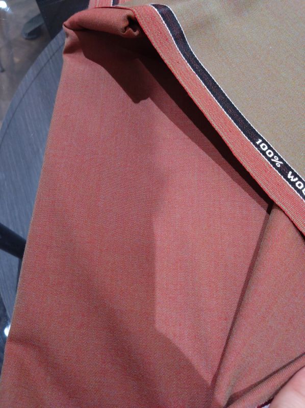 この生地はソラーロとも呼ばれ、経糸と緯糸を異なる色の糸を用いており、光の当たり方で玉虫色のように色が変わるのが特講です。