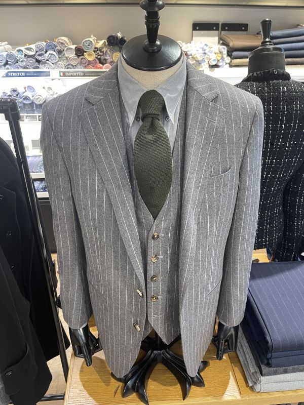 英国らしいチョークストライプは、クラシックでありながら存在感抜群。