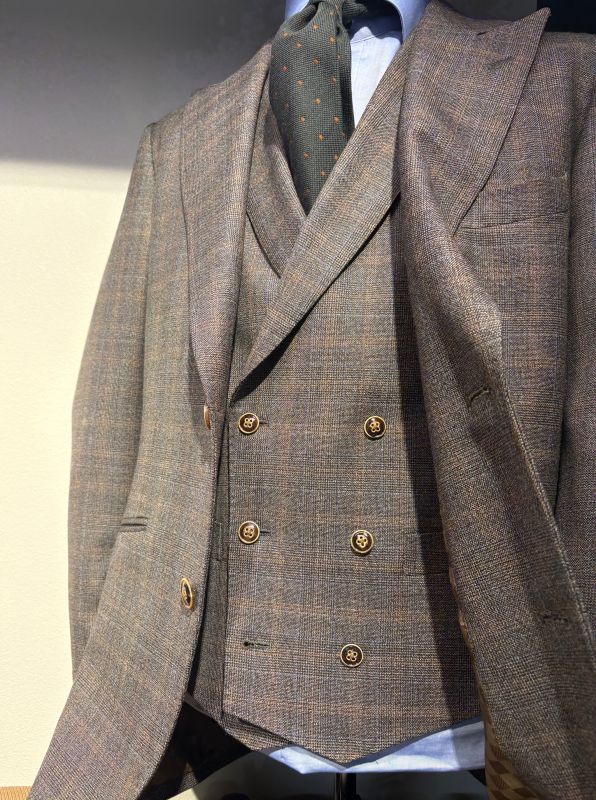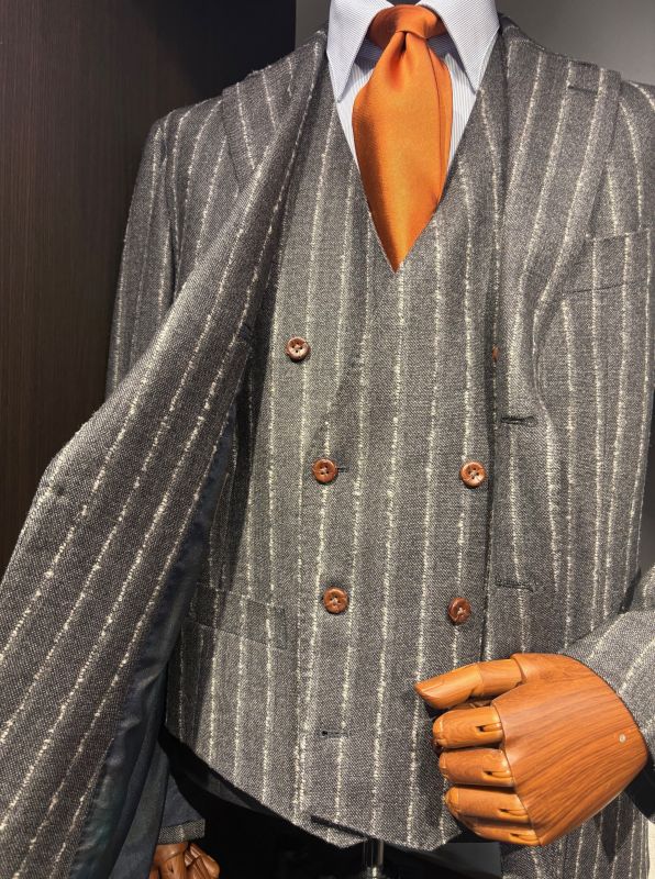 ダブルベストの存在感はそのままに、衿を省くことで軽快さをプラスしたベスト。