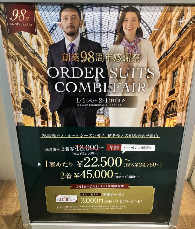今ならお得な早割フェアが2着まとめ買いで¥3,000の割引クーポン利用でお得です!