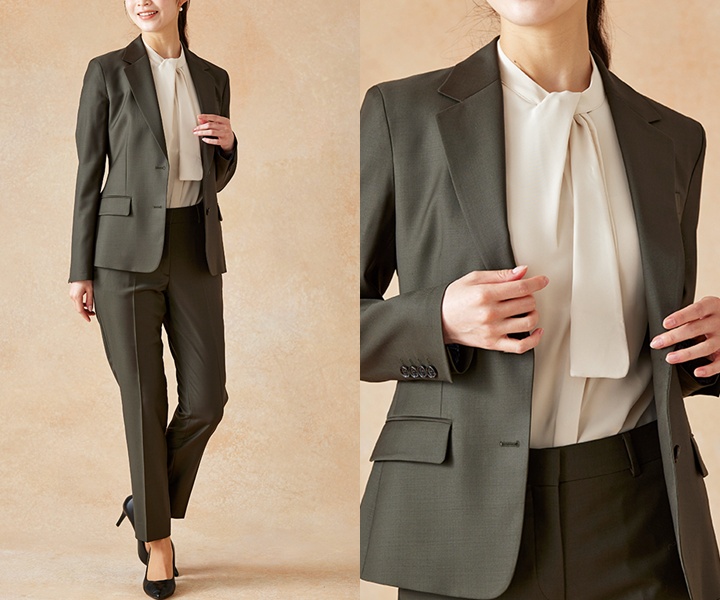 ブラウスとジャケットの優しい雰囲気に、シックなパンツが全体をまとめてくれます。