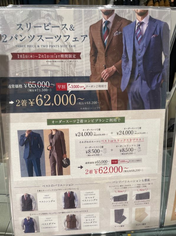 通常スーツ定価の35%でお仕立ていただけますが、スーツ2着コンビでお仕立ていただくと