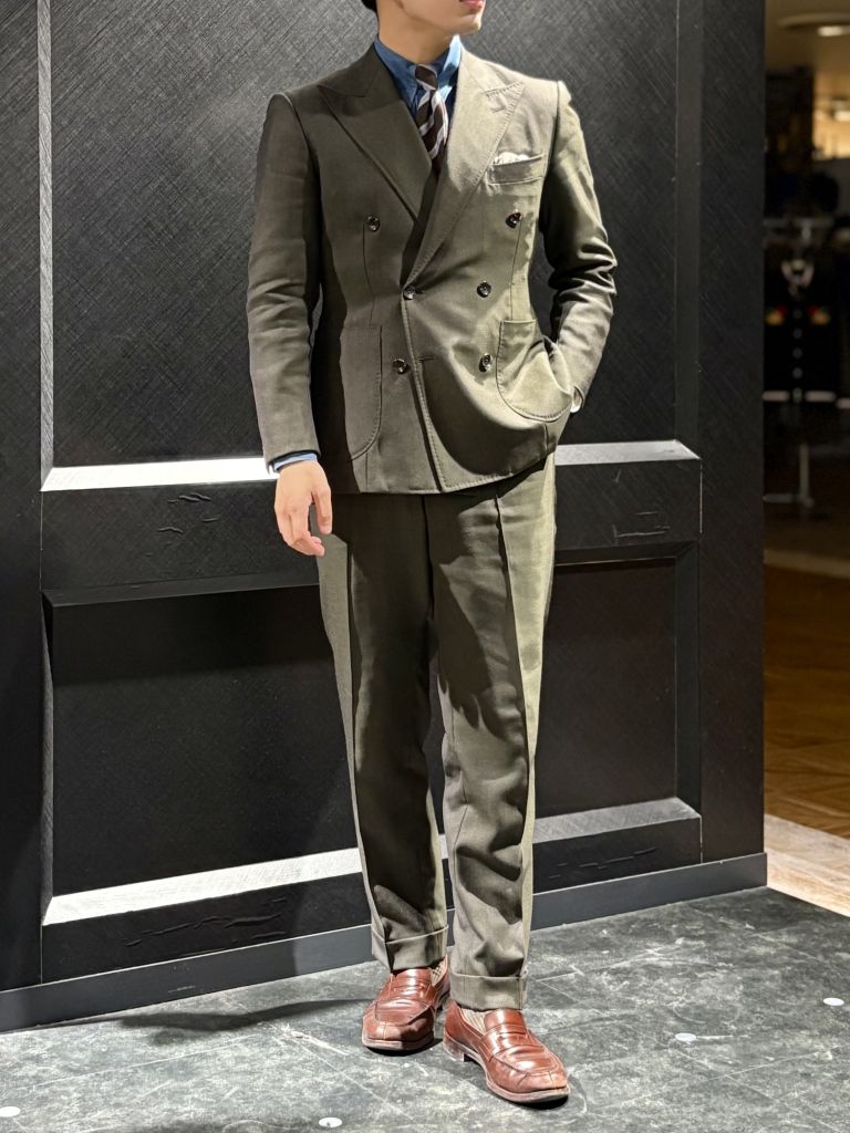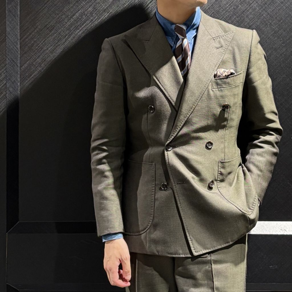 細身のダブルブレストもトレンド味が強く、オーダーらしさは演出ができますね〇