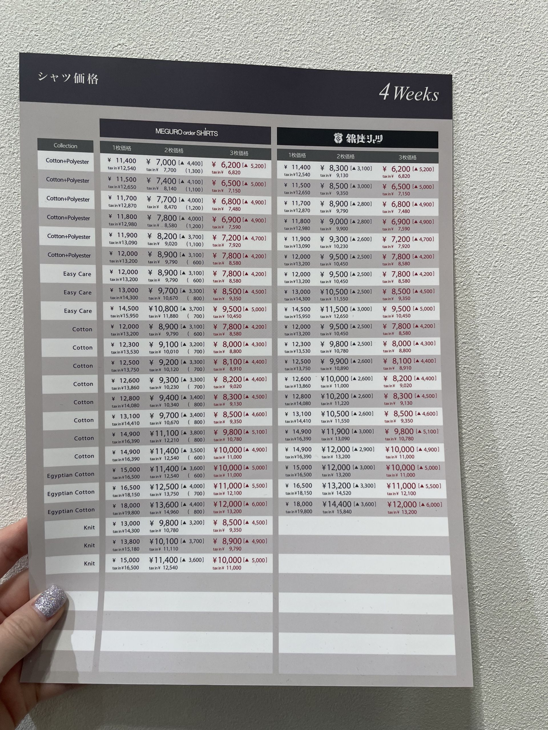 シャツの価格表になります。
