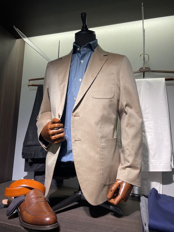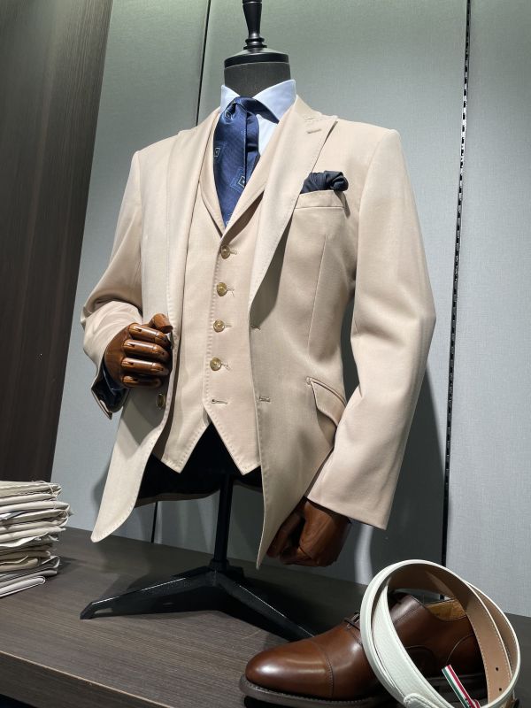 ベージュのスリーピースに青色でまとめたVゾーン。