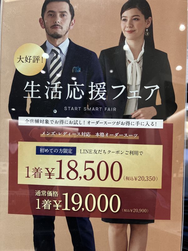スーツは20,350円(税込、ラインクーポン適用時)からお仕立て可能でございます。