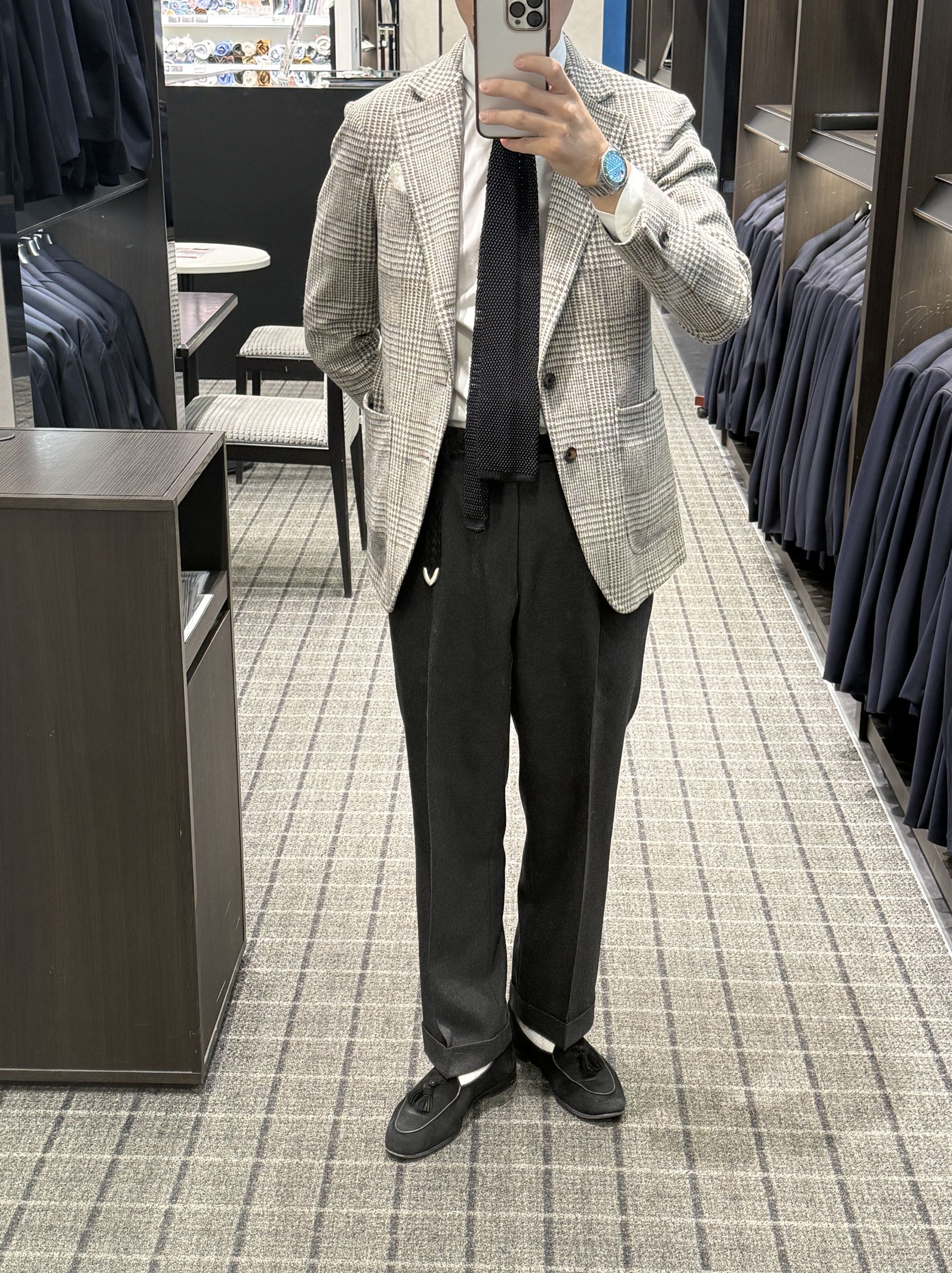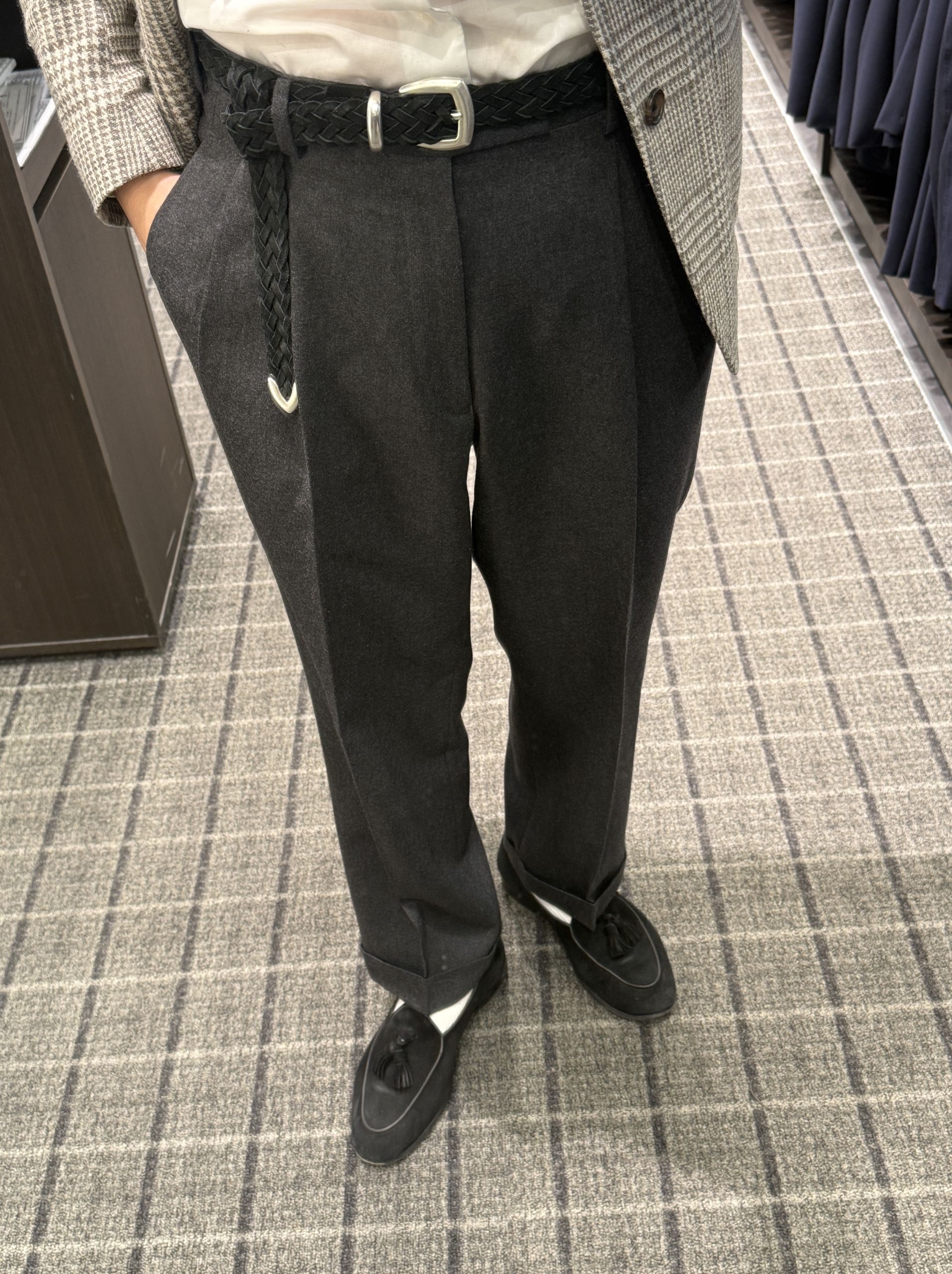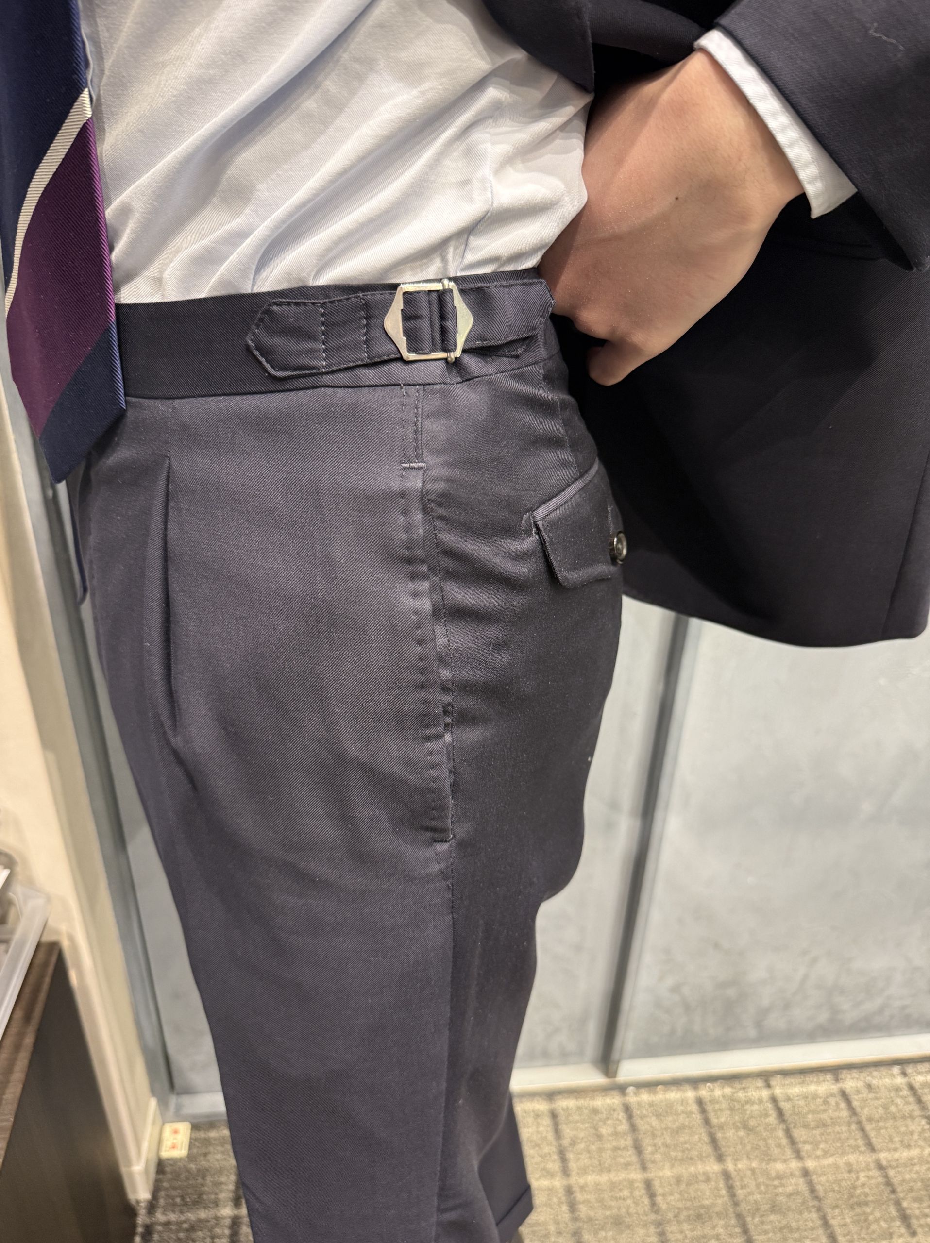 本日はスラックスのベルト付ける派なのかベルトレス(脇尾錠付き)派なのかになります。