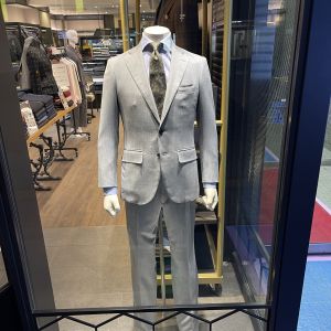 今回ご紹介するのは、ライトグレーのスーツを主役に、ブルーを効かせた爽やかなコーディネートです。