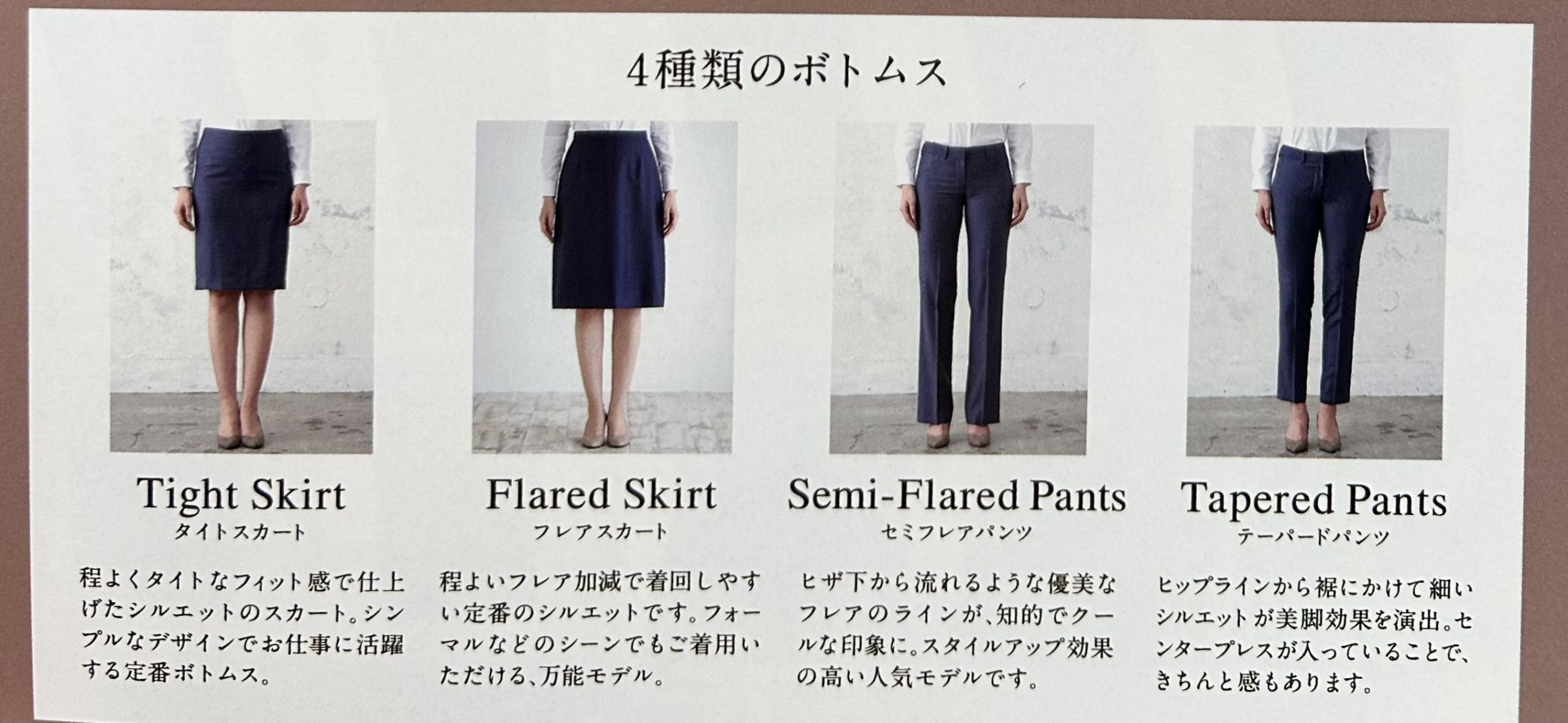 ブラウスやシャツ、パンプスもオーダー可能なので