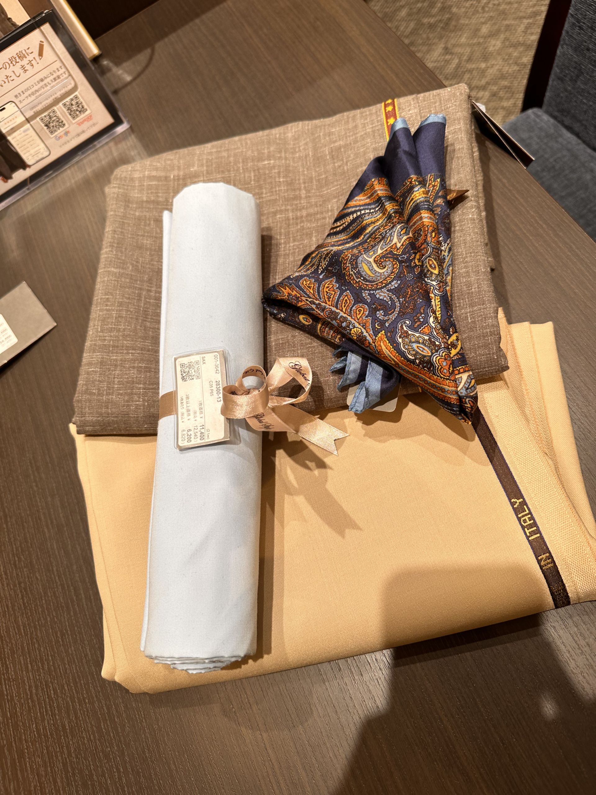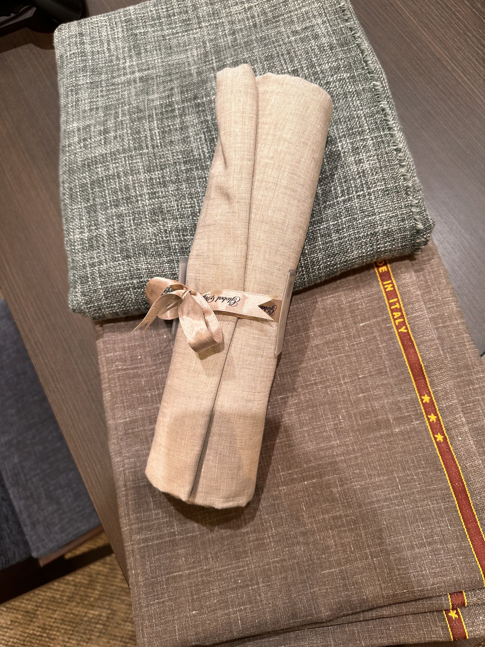ブラウンのリネン、ウール、シルクの生地に通気性のいい平織のベージュをチョイス!