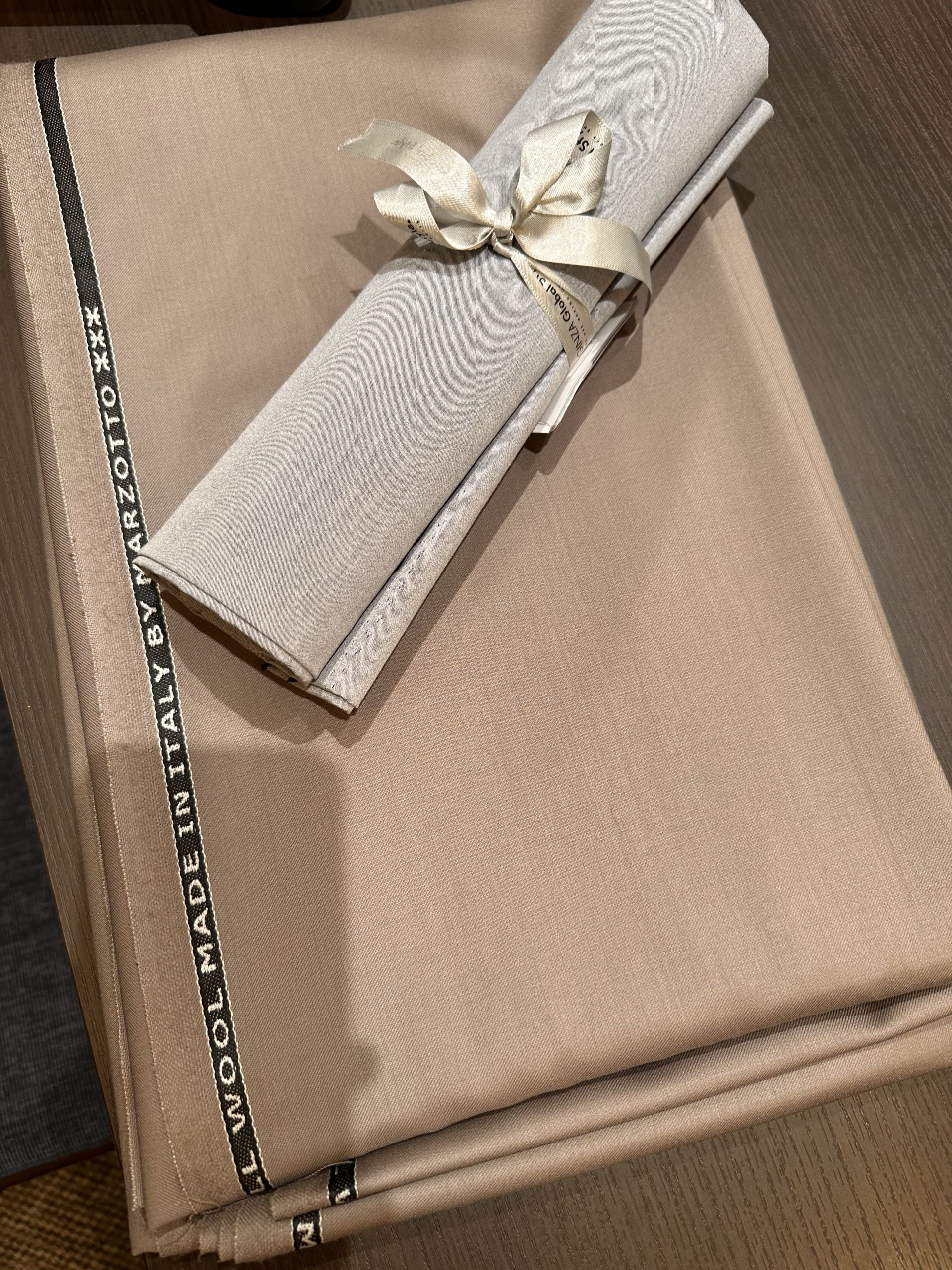 数あるベージュの中からこちらの生地を選んだ理由としては黄色味の強いベージュが多い中グレー味が強く光沢感が際立つからとのことです。