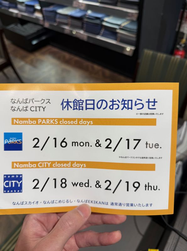 なんばパークス店は2月16日(月)、17日(火)が定休日となっております!