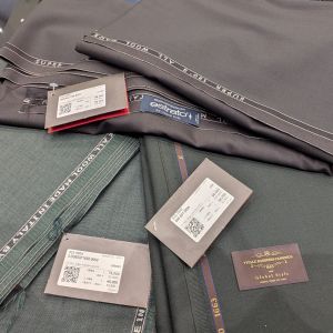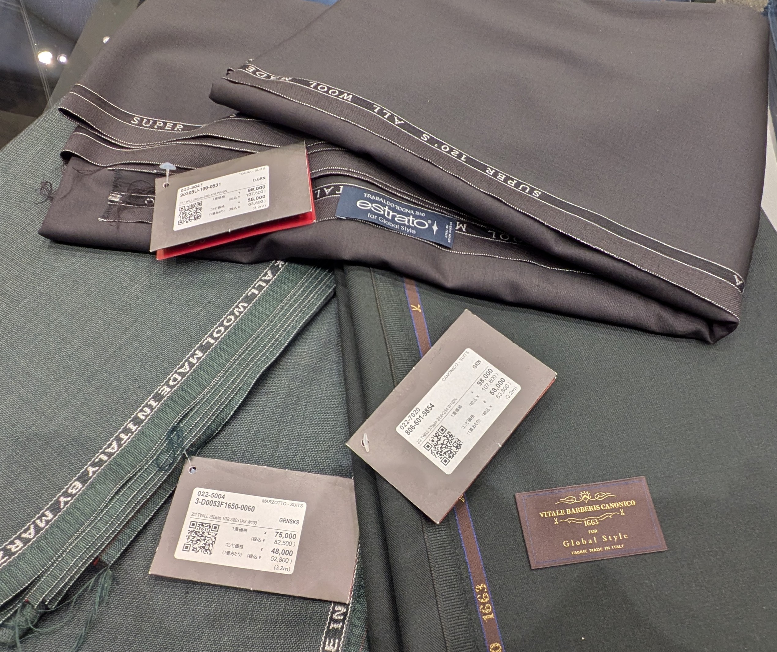 一番上の生地は分かりずらいですが、ダークグリーンで肉眼で見ると、チャコールグレーと深緑が混ざったようなシックなお色味です