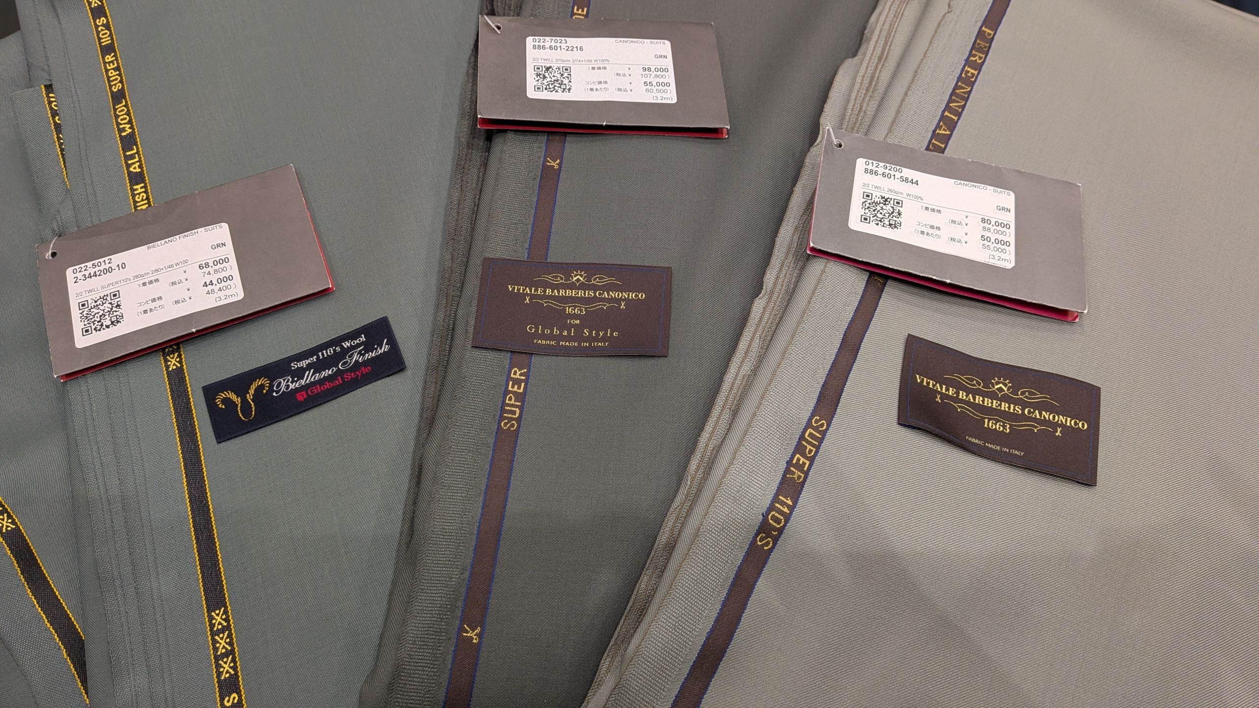 右側の生地は、白灰色に緑を一滴混ぜたような落ち着きのあるお色味で、個人的なお気に入りの生地です(笑)