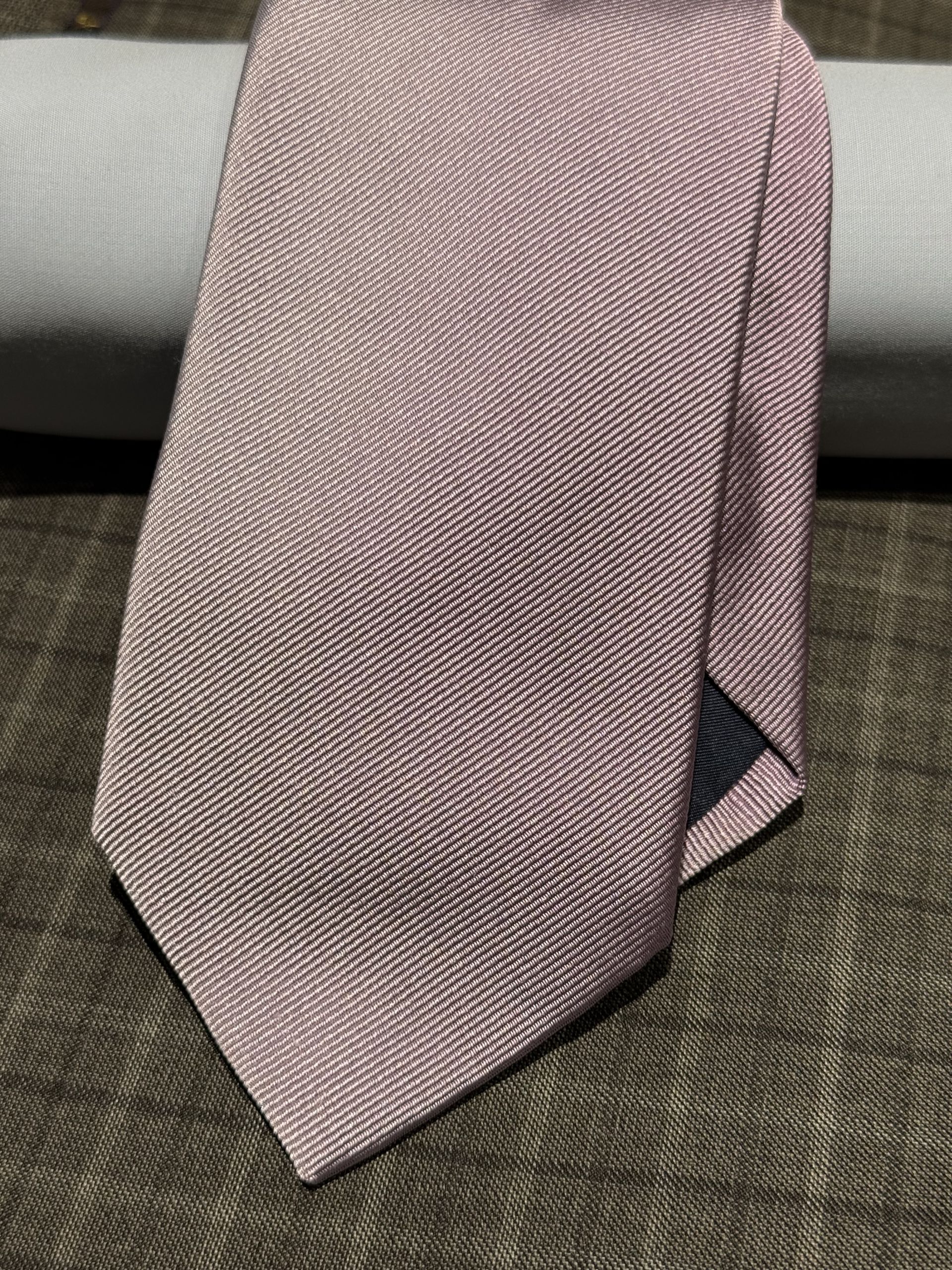 サックスブルーのシャツにピンクのタイを合わせれば、桜の木を想起させる華やかなコーディネートが完成します。