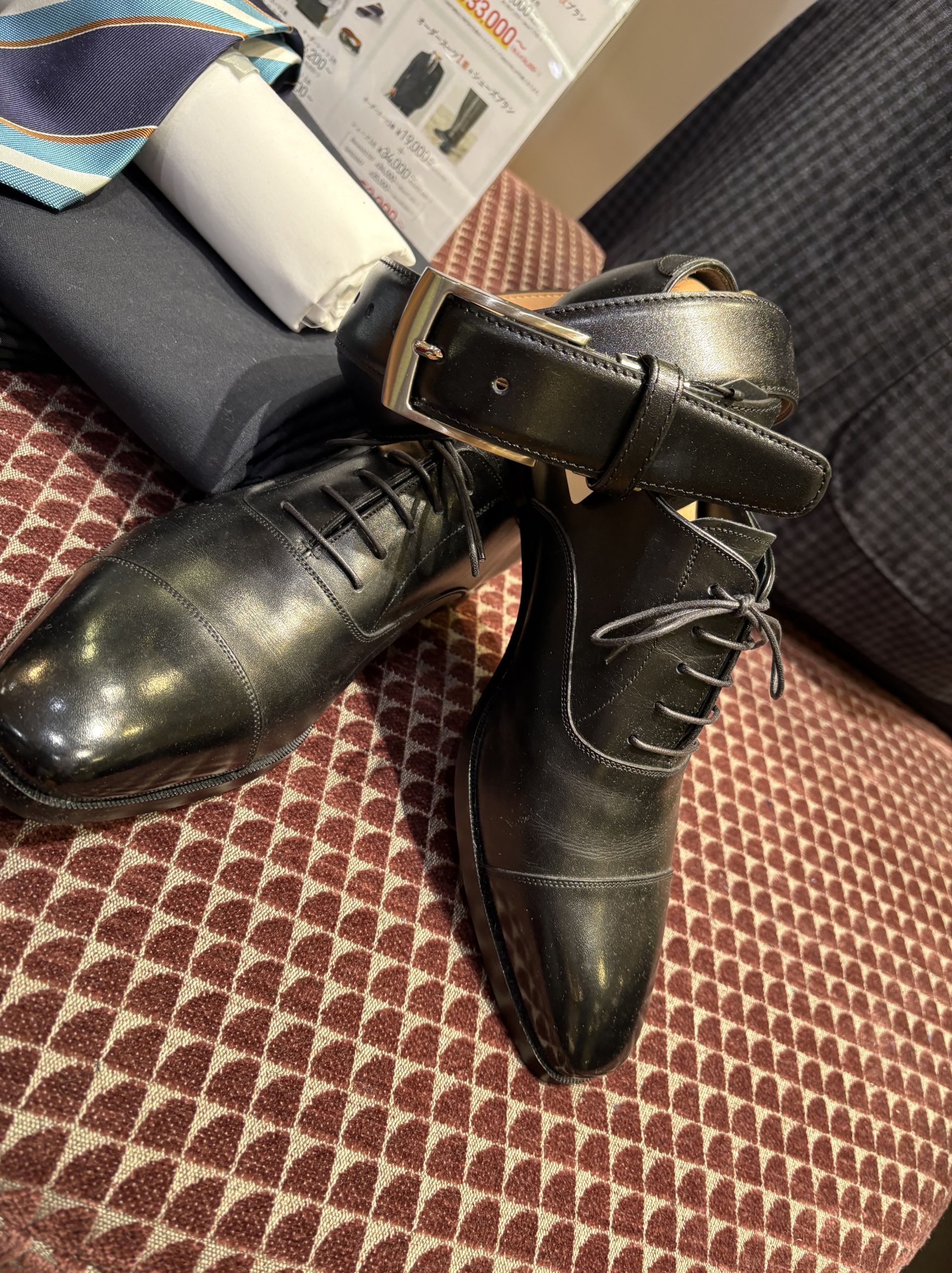 靴とベルトは無難に黒で揃えてOK。お勤めにも慣れてきたら、茶などに挑戦を。