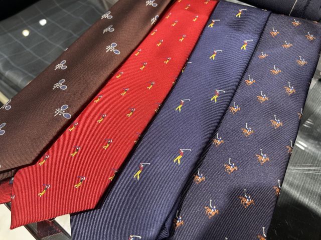 ゴルフ柄や乗馬柄だったりと他のネクタイとはかぶりにくいデザインで普段のスーツコーデのアクセントにめちゃくちゃオススメです。