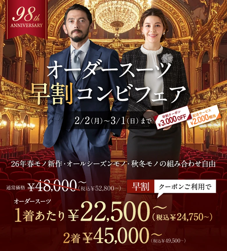 私が特におすすめいたしますのが 【オーダースーツ早割コンビフェア】になります!!