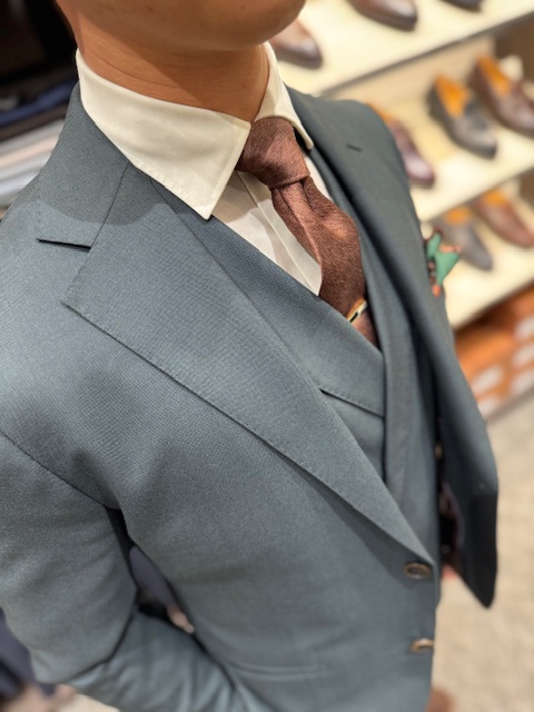 グリーンのスーツにブラウンのネクタイ、ブラウンのスエードシューズでまとめたコーデになります。