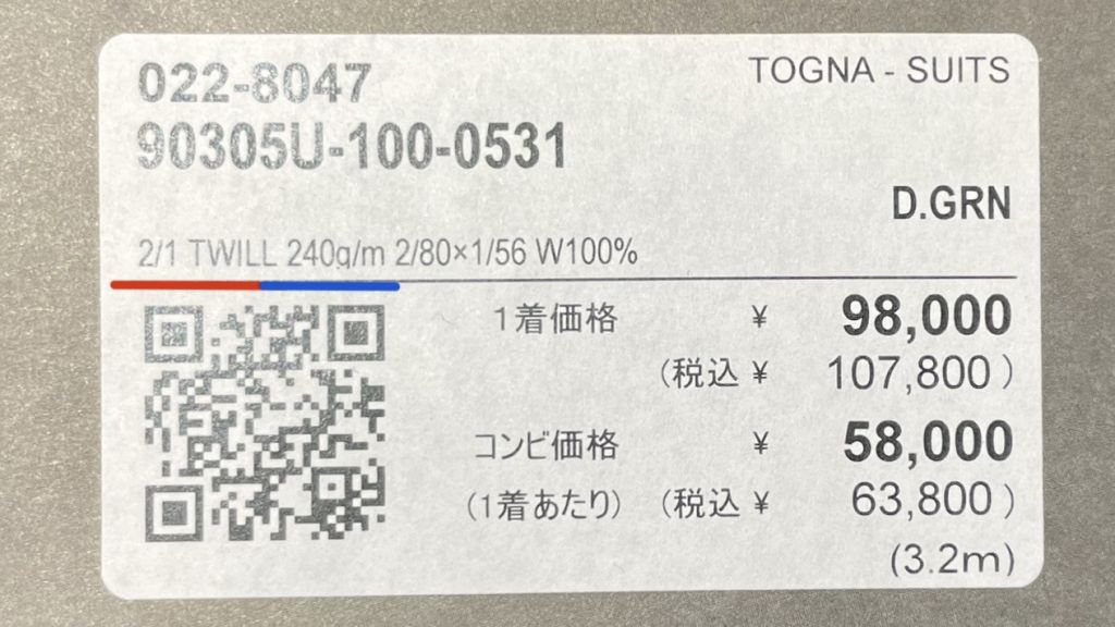 グローバルスタイルではスーツの仕立て料金を生地に付けて陳列してありますが
