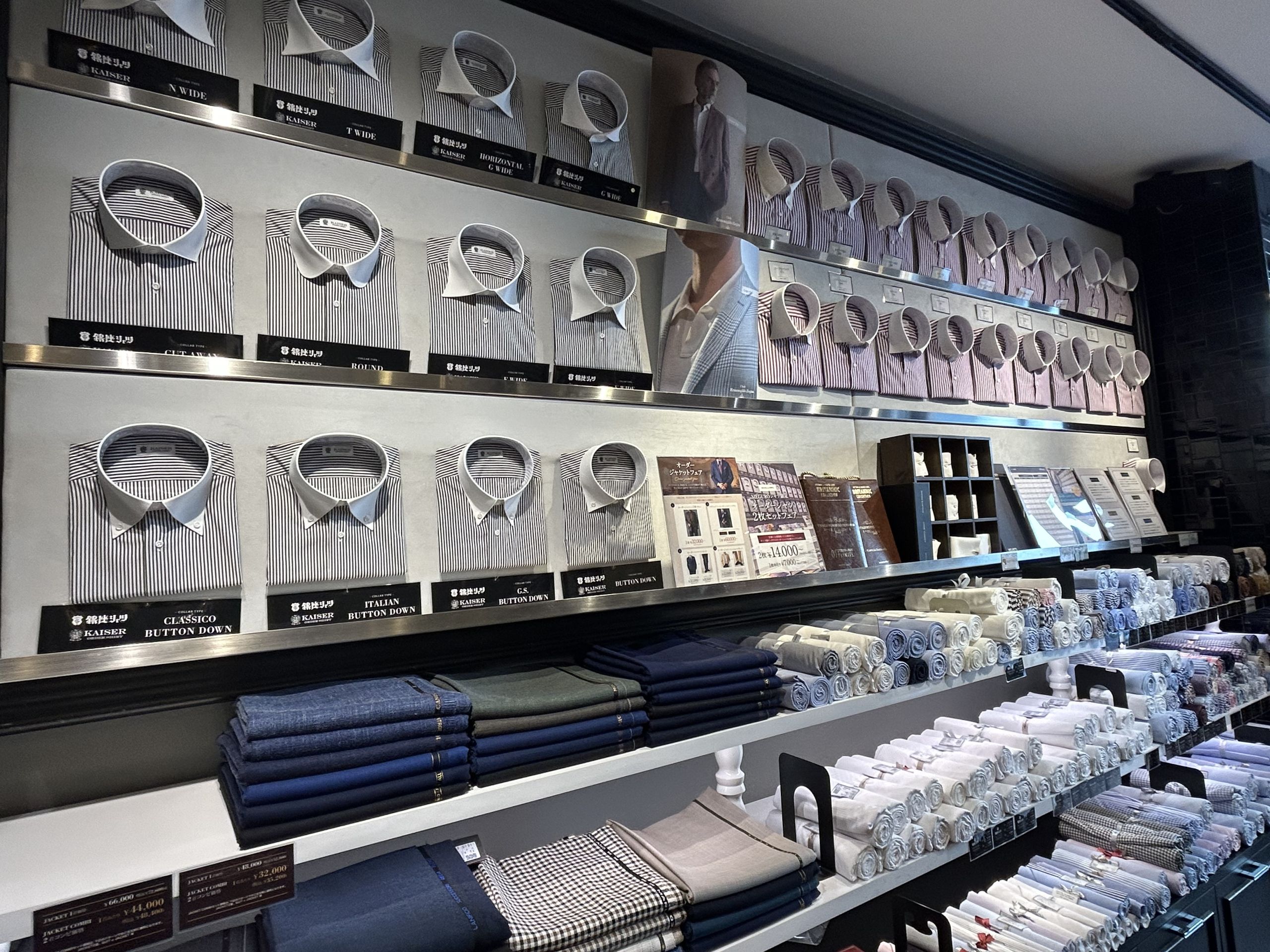 首回り、肩幅、身幅、袖丈と細かく調整にお客様に合わせたお仕立てを様々なカラーやモデルから行います。