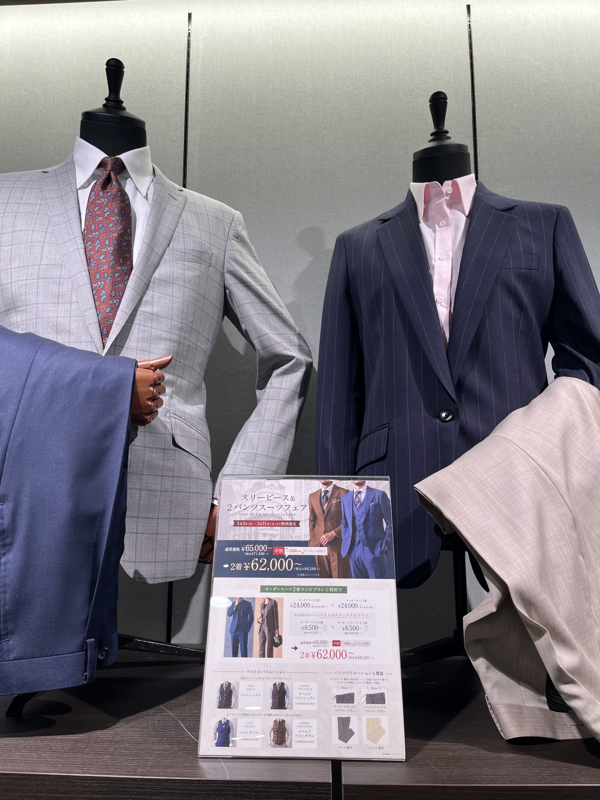 スーツ二着で1着あたりがお安くなるのに加えて、