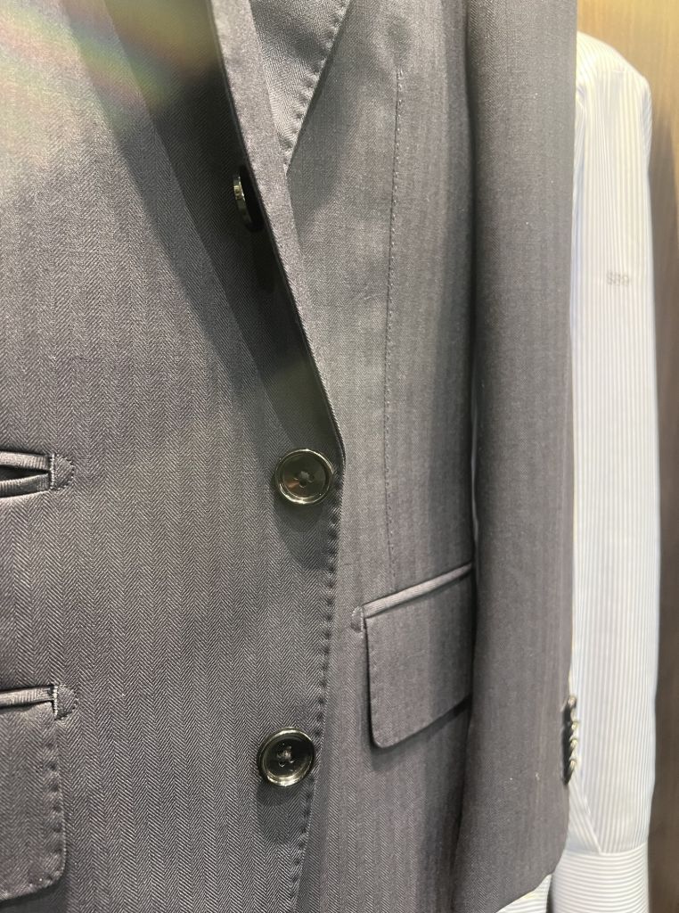ラペル裏に隠れたとこにボタンがございます。一番上のボタンは飾りボタンとなりまして、