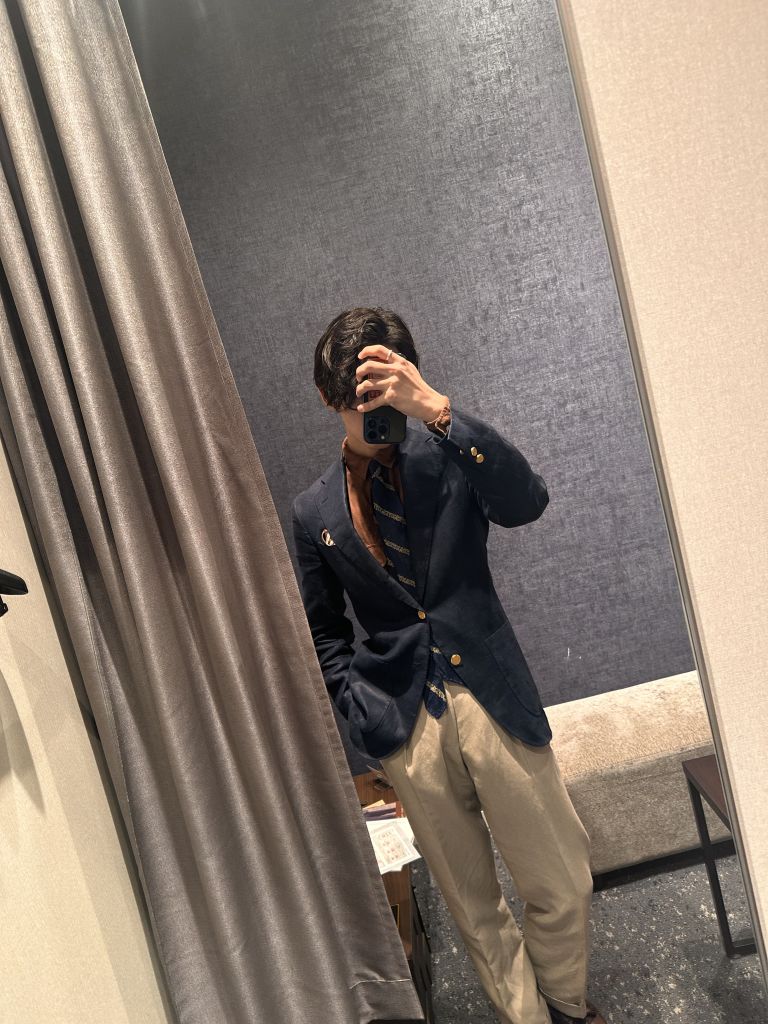 ネイビーのリネンブレザーにブラウンリネンシャツ、スラックスはウール&リネンの白スラックス。