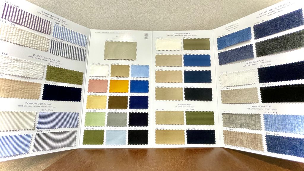 今回撮影しましたのは、SS生地のラインナップ。色味も軽やかですし、珍しいデニム生地が