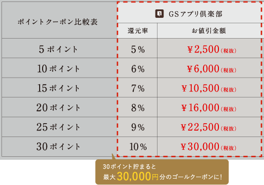 ポイントシステムは、5ポイントごとにご利用いただけて、ためるほどに還元率がUPしていきます!
