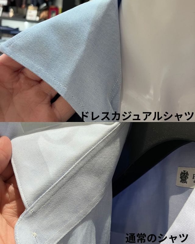 一般的なシャツの襟は台襟と羽根襟が別パーツで構成されていますが、ドレスカジュアルシャツはそれが一体になっている為、