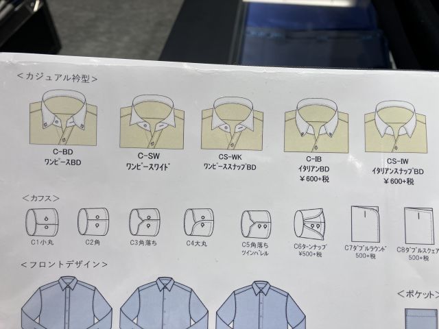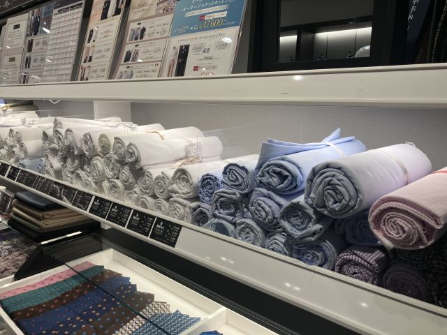 お見せした仕上りサンプルのシャツはブルーですが、通常のシャツと同じく様々な生地からお選びいただけます。