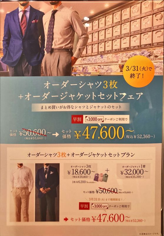 本日は、オーダージャケット+オーダーシャツ(三枚)のフェアをご紹介します。