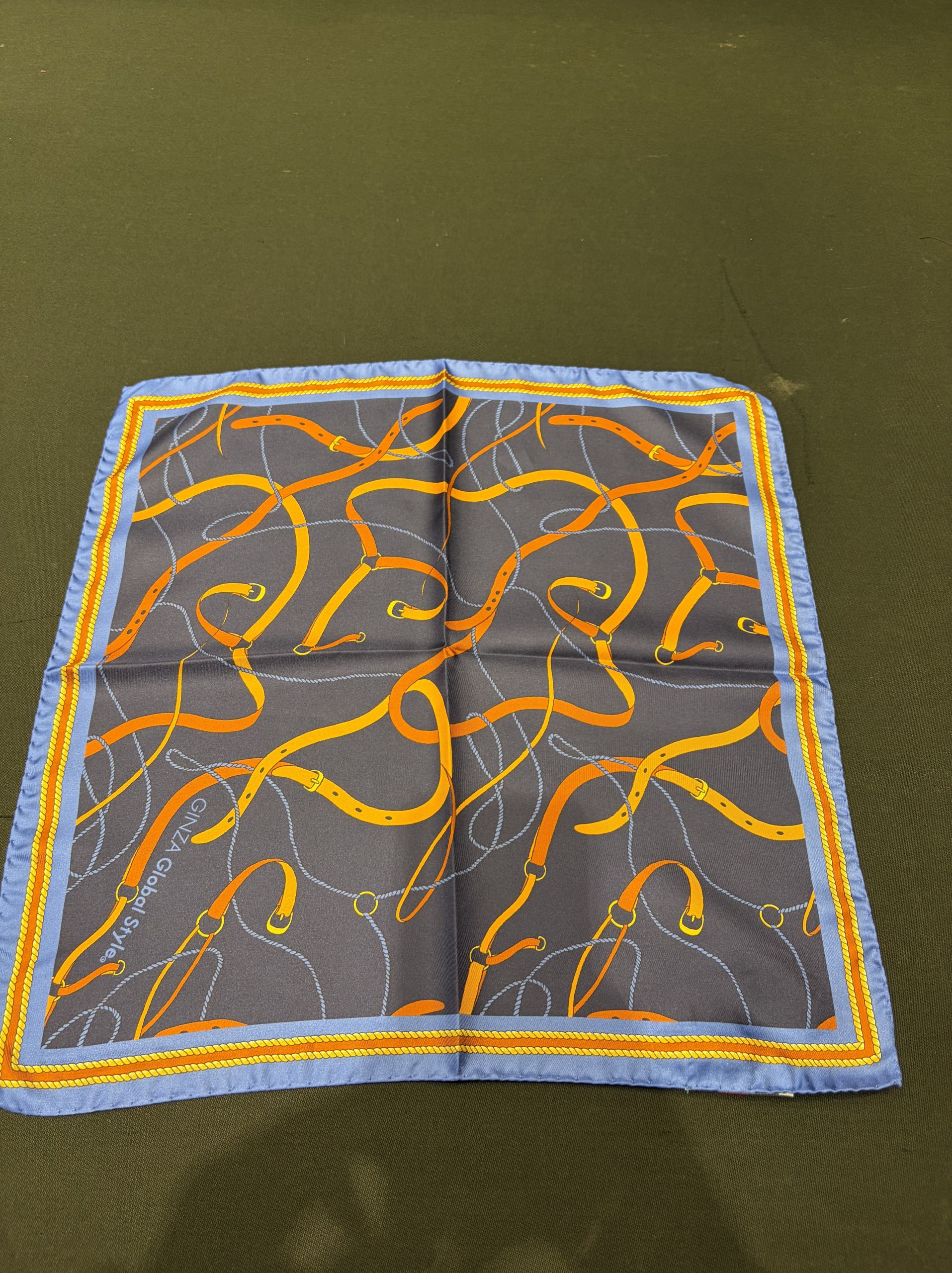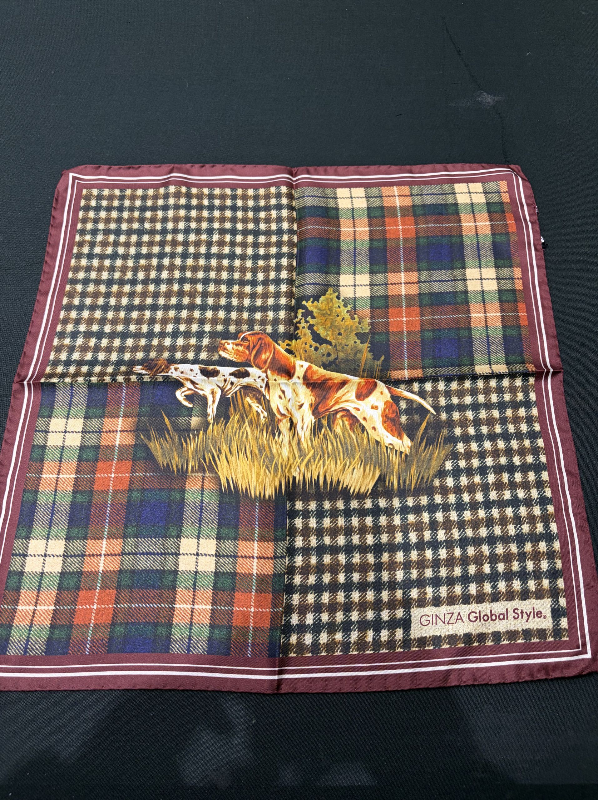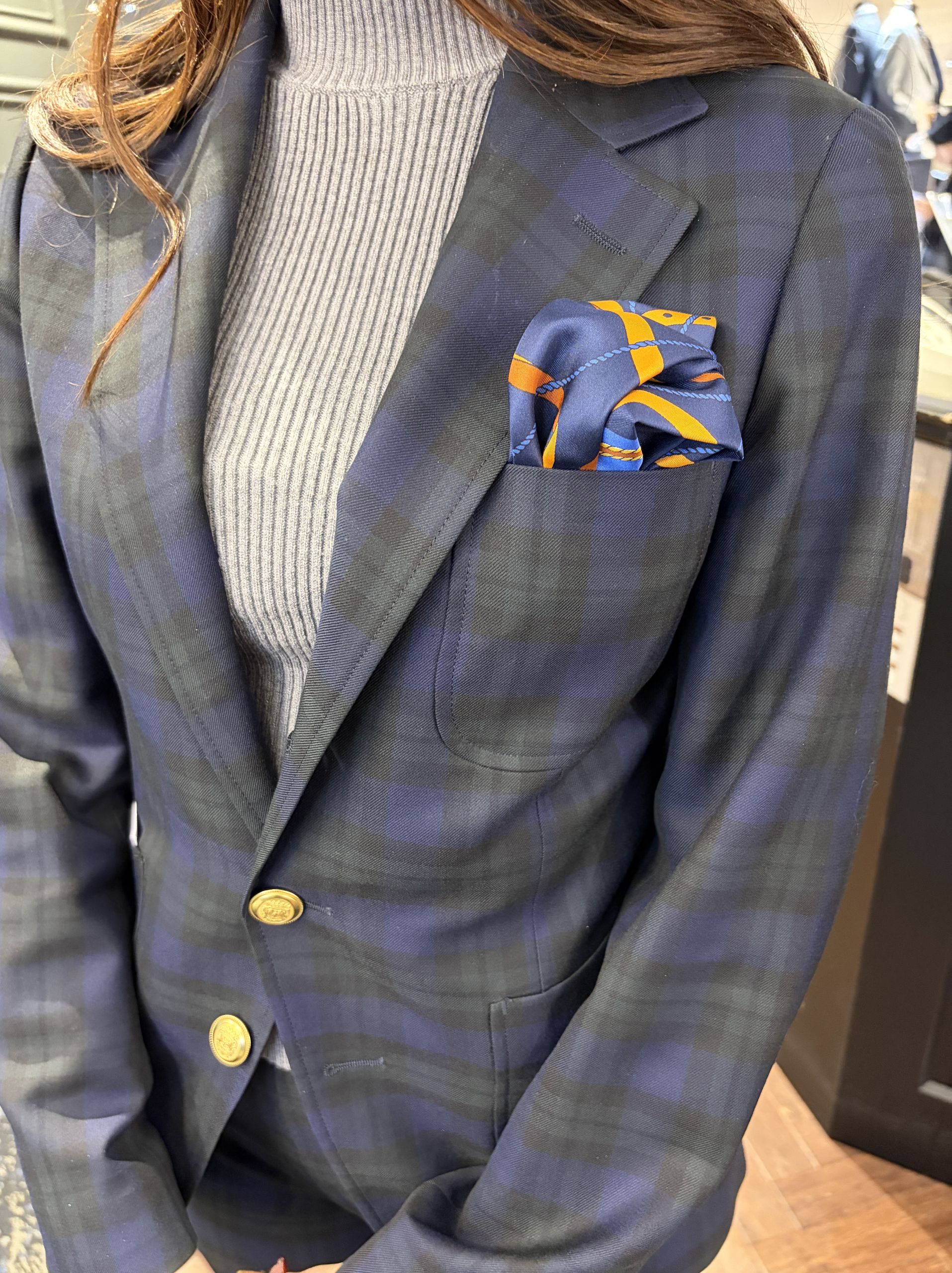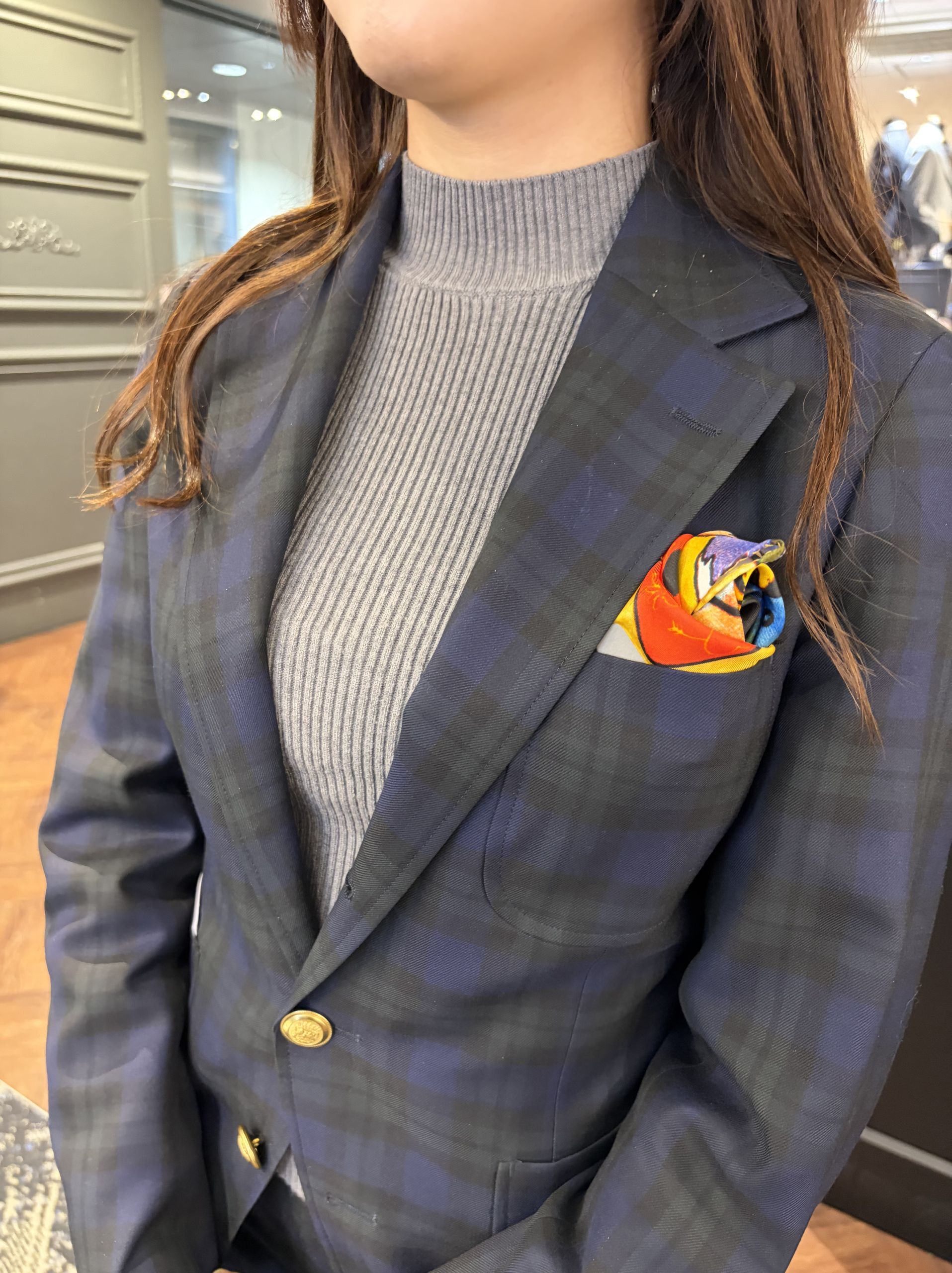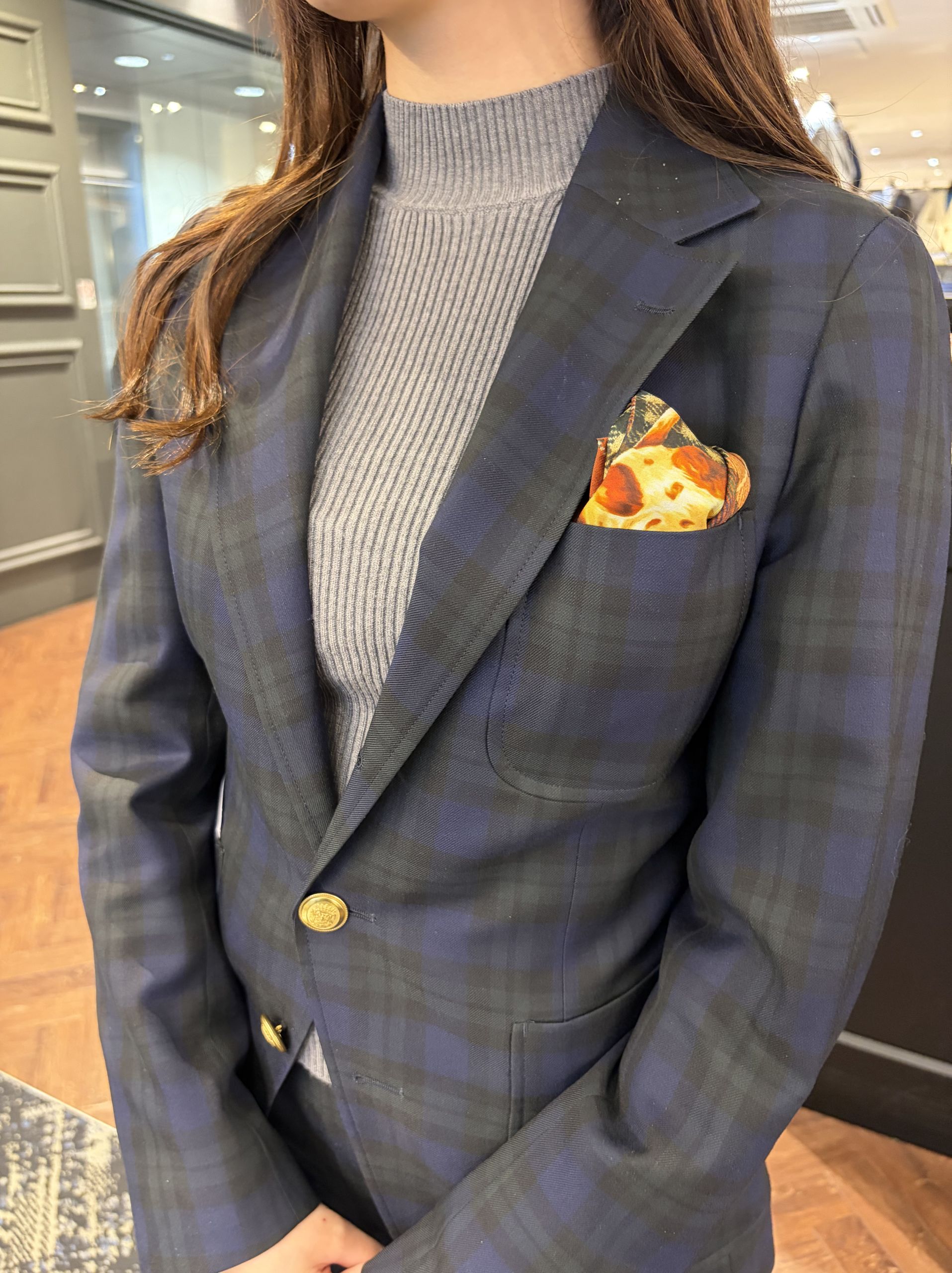 派手なチーフが3種類入荷致しましたので着用画像と共にご紹介させていただきます。