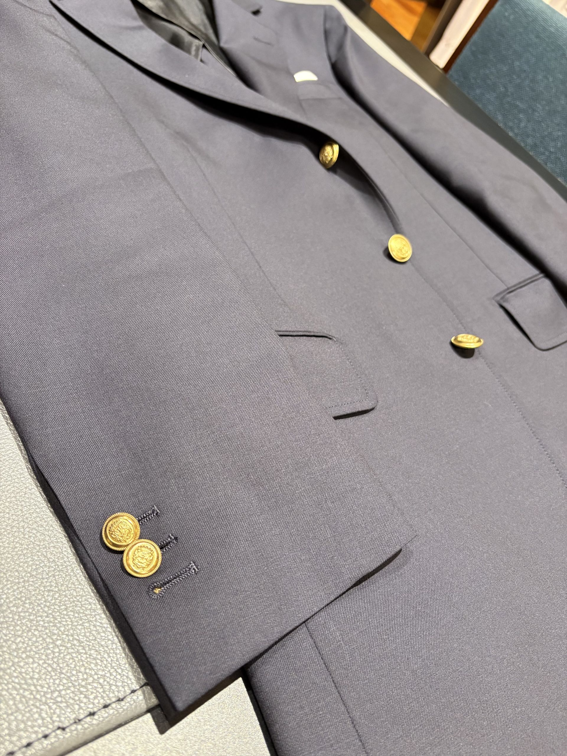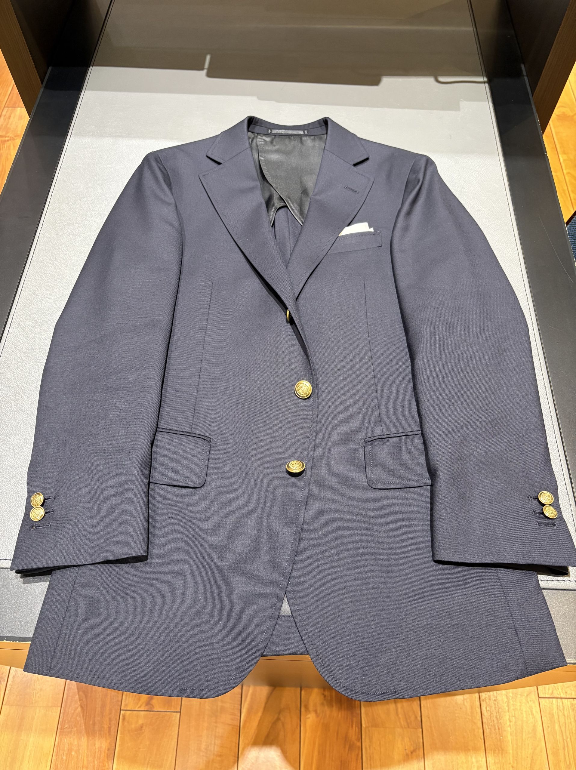 濃紺無地で金のメタルボタンを合わせ、王道な紺ブレに仕上がりました。