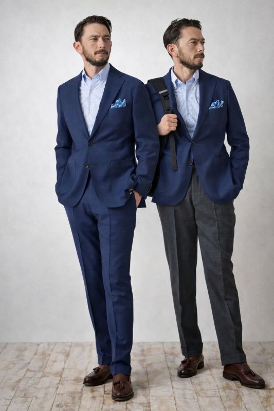 同じスーツの上と下を入れ替えて、「ジャケパン風」にも楽しめるコーディネートです。