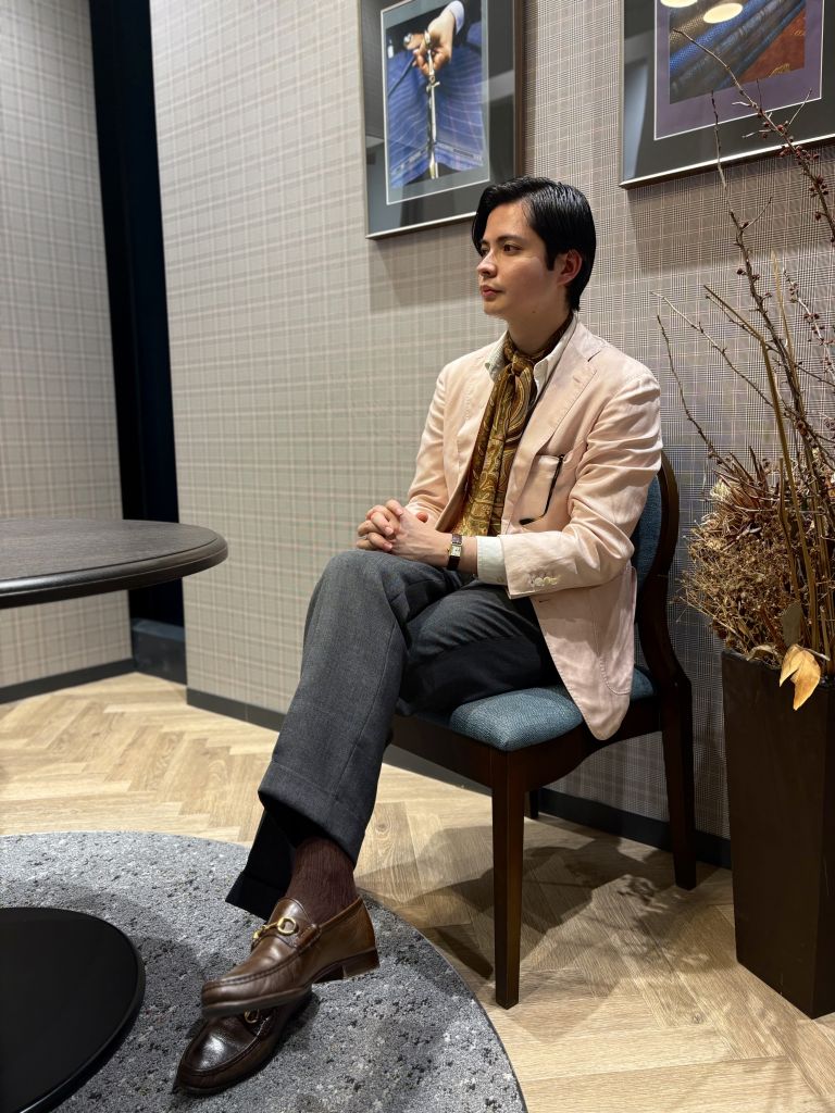 パンツは、ジャケットが彩度が薄いサーモンピンクに対して、ミディアムチャコールのカラーを入れて、コーディネートを締めております。