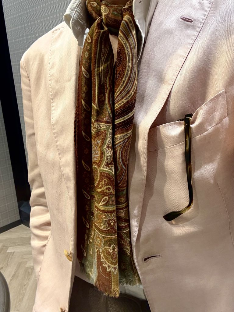 ジャケットは色はサーモンピンクでリネン50%シルク50%のヘリンボーン柄になります。