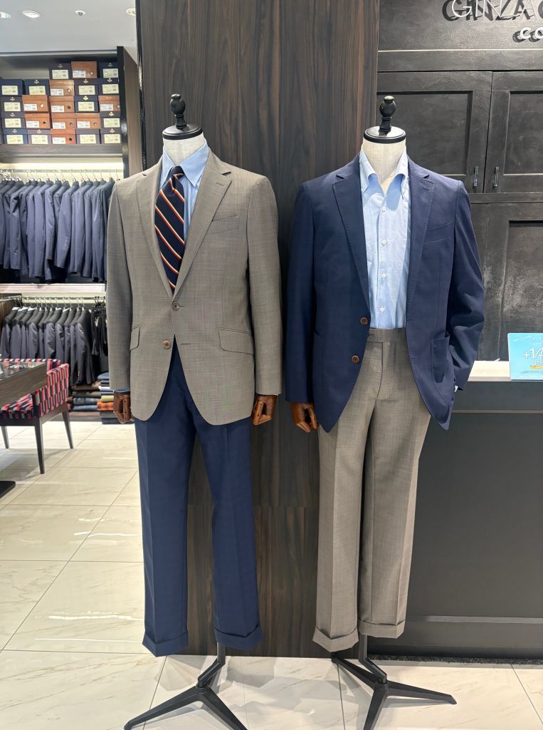 向かって左側が、グレーのジャケットにネイビーのパンツ。