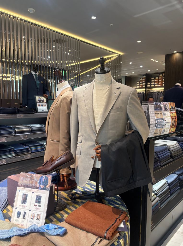 こちらはベージュのジャケットにダークグレーのパンツです。