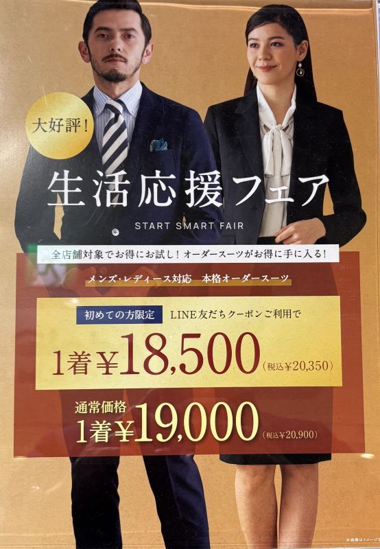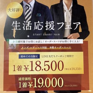 1着 ¥18,500(税込 ¥20,350)~ スーツのオーダーが出来ちゃいます。
