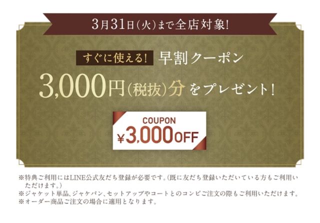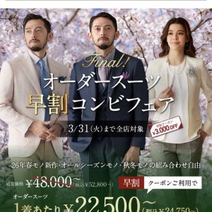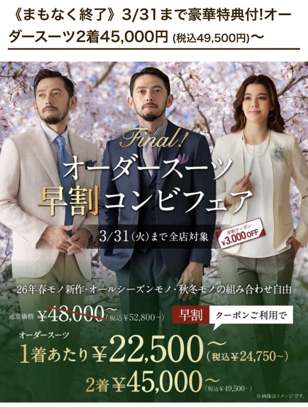 スーツ2着以上ご注文で総額から3000円お値引きさせていただきます。