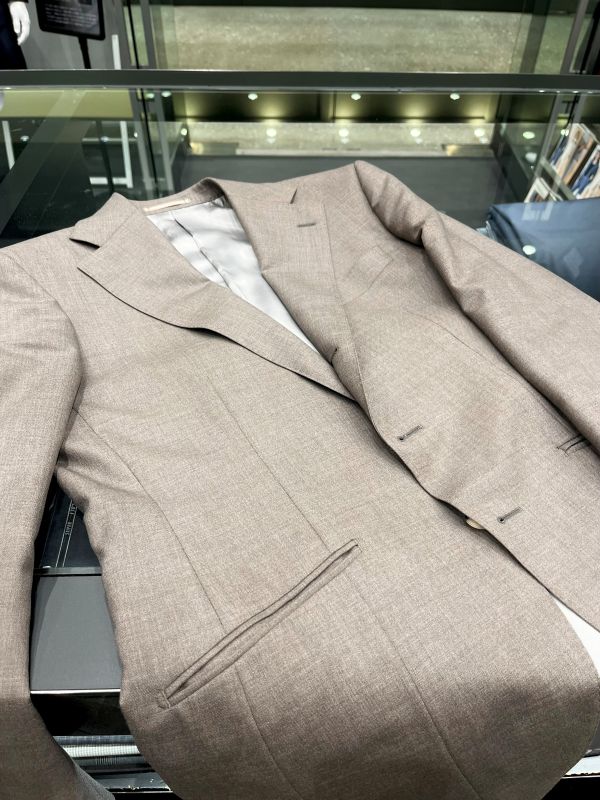 生地はカノニコの強撚。目付が290gとしっかりと厚みがありつつイタリア生地らしい柔らかさがとてもいい具合ですね。お色味もベージュでこれからの季節にピッタリです。