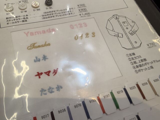 あとオーダーと言ったら、「ネーム刺繡」です!。ワイシャツ一枚につき700円でお入れできます!