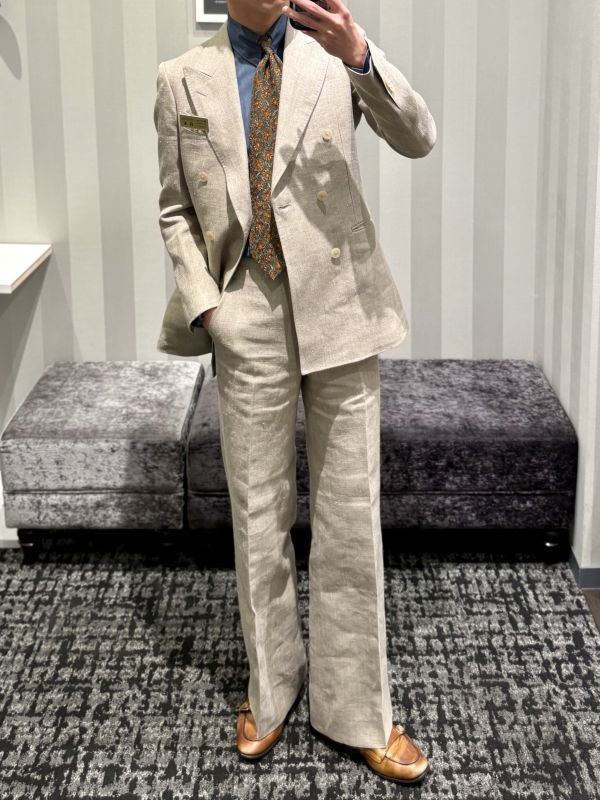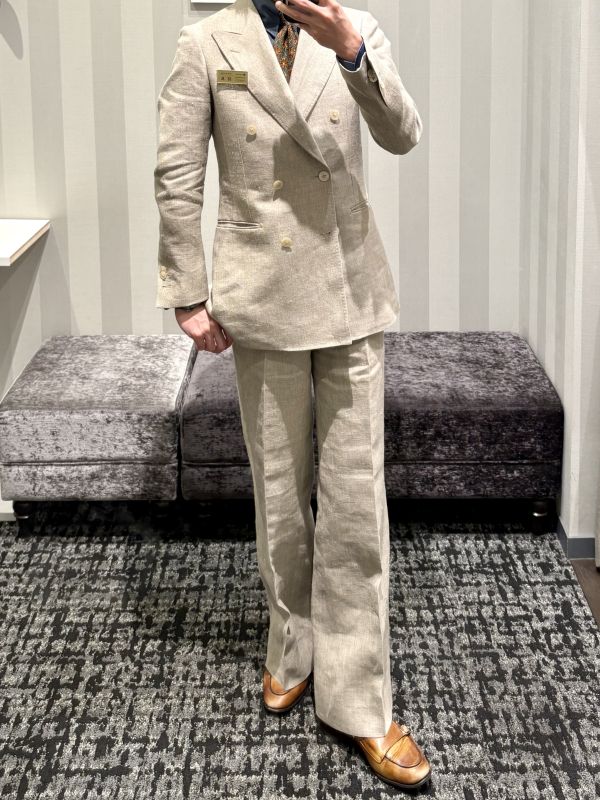 リネンの大人気ブランド SPENCE BRYSON よりベージュダブルスーツです