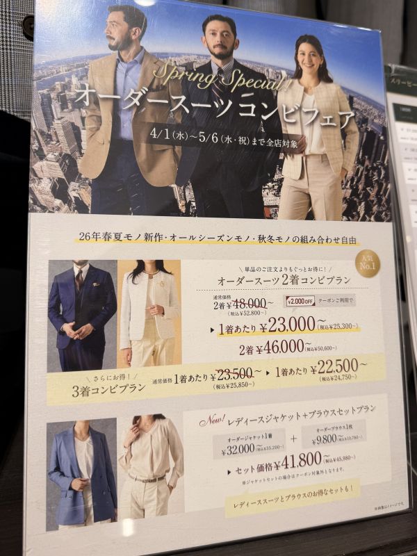 現在、2着で46,000円(税込み50,600円)~スーツコンビフェアを開催しております。