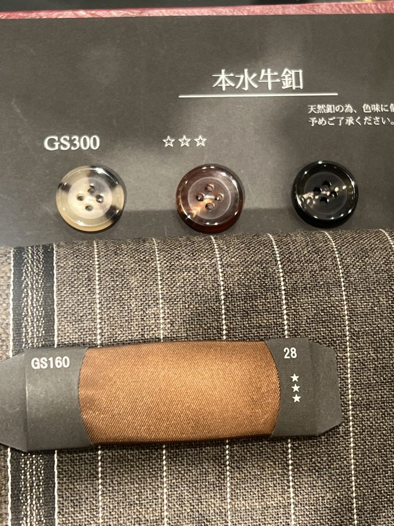 釦は水牛釦の左側のナチュラルなデザインに裏地はサラッと肌ざわりのよいキュプラ素材をチョイスしました。