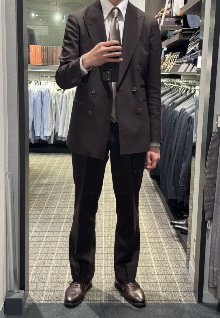 ダブルスーツに仕立てたダークブラウンのスーツです。